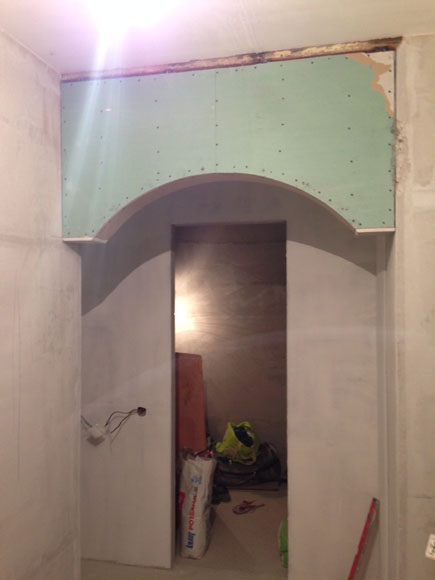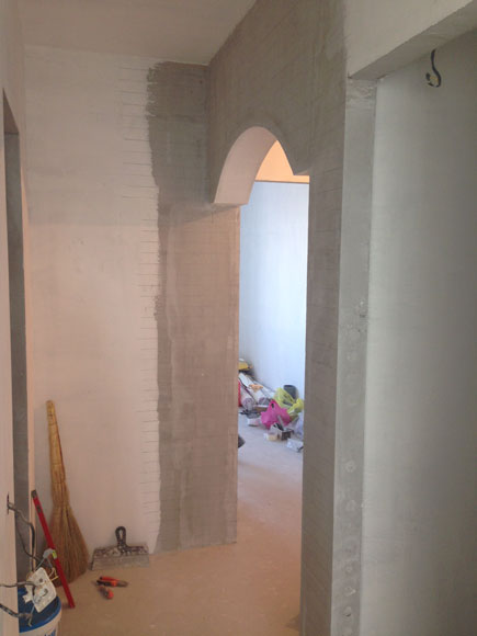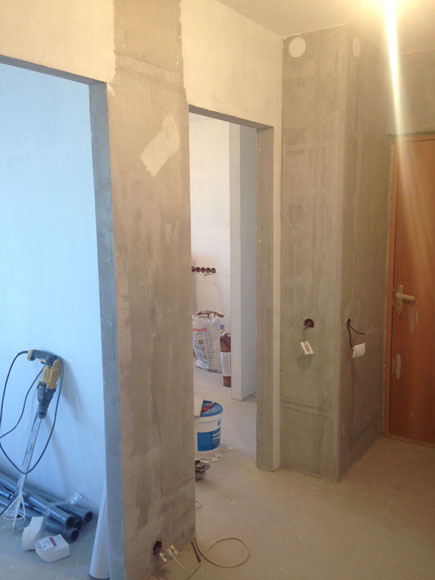 Стягиваем полы сухой и мокрой стяжкой. Грунтуем и выравниваем стены, пол и потолок, также возводим дополнительные стены, заливаем полы. Возводим гипсокартоновые конструкции.