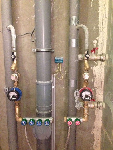 Подготавливаем штробы для разводки полипропиленовых труб, устанавливаем и подключаем гребенки, опрессовываем трубы, выводим горячую и холодную воду на кухню.